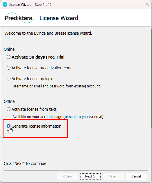 Select “Generate license information” and press “Next”.