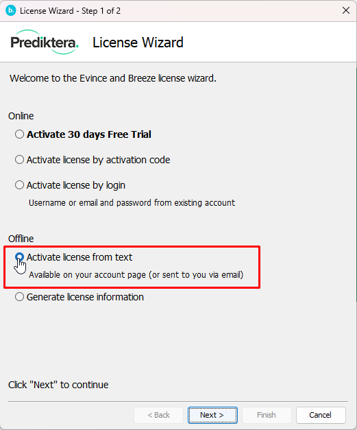 Go to license wizard and select “Activate license from text” and press Next.