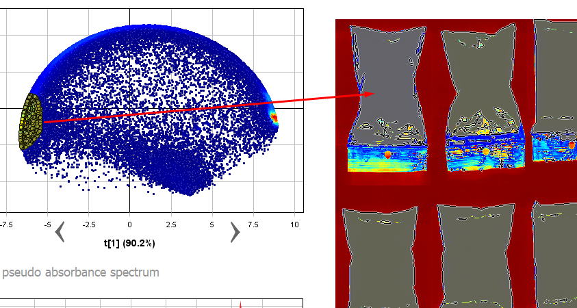The “Max variance image” is colored by the variation in the 1st component of the PCA model (the X-axis in the scatter plot, i.e. “t1”), and visualizes the biggest spectral variation in the image. In this case this is the difference between the sample (blue) and the background (red).