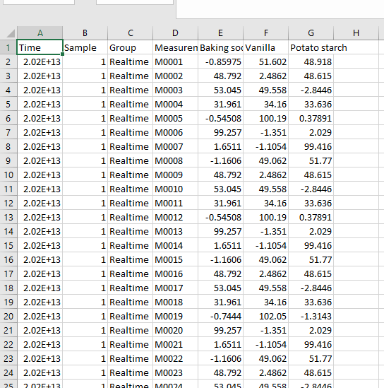 Press the “Analyse Tree” tab to see the steps in the “Workflow”. First, the “Measurement” (image) is analyzed by your sample model (“Sample - Powder Quantification”) to find the sample “Object”. For this object, it then applies your quantification model to calculate the variables (Baking soda, Vanilla, Potato Starch).