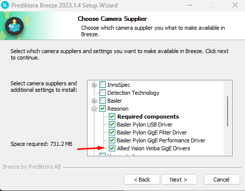 Ensure the Allied Vision Vimba GigE Drivers are installed, part of the Breeze installation or available for download from Allied Vision: https://www.alliedvision.com/en/products/vimba-sdk/#c1497
