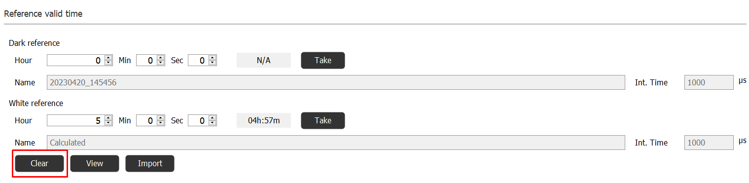For example: If you store references for 8 hours, and take a white reference for the integration time 1000 it will be re-used for that integration time for 8 hours before it expires and has to be retaken. However, if you change integration time to 1100 after 4 hours and capture a new reference it will be cached for 8 hours from that point. If you immediately switch back to integration time 1000 it will continue to re-use the previously saved reference.