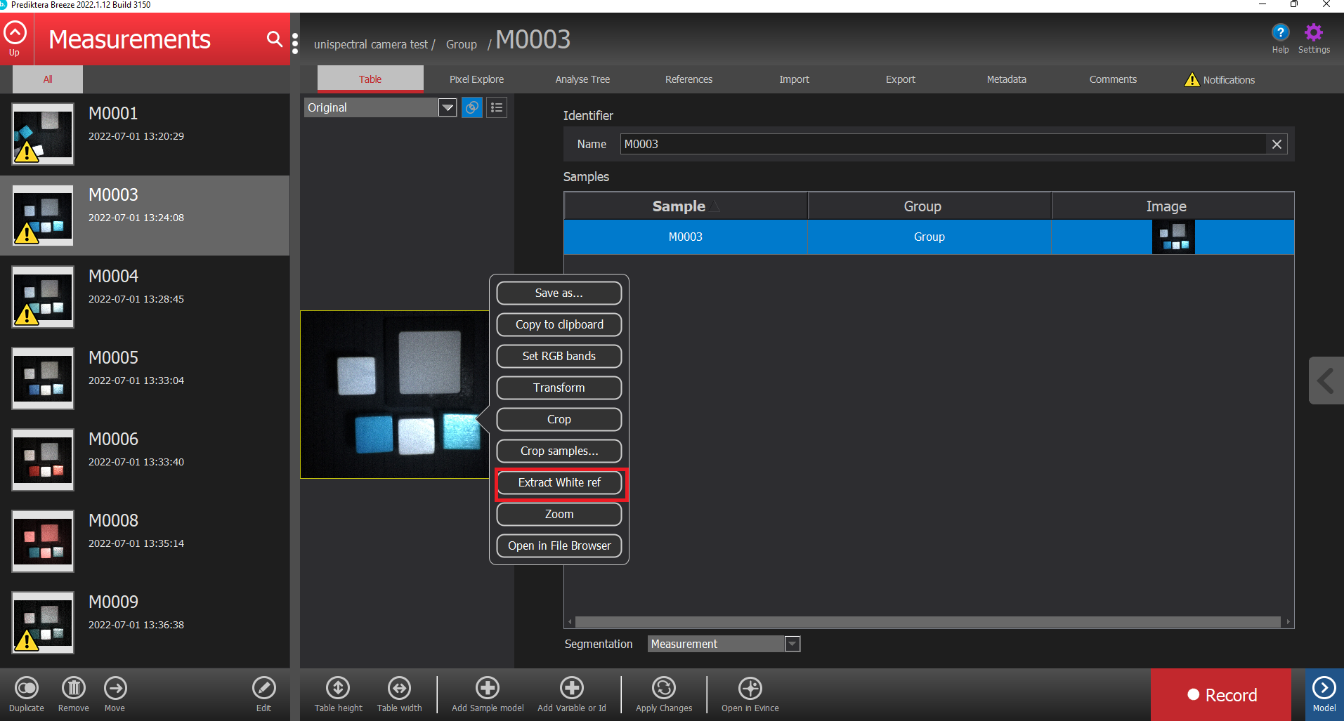 When you have recorded an image you need to extract the with reference from the images. Go into the group by double-clicking on the group. Right click on the images so the hidden menu shows up. Select “Extract white ref”.