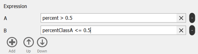 percent of pixels of Class A less or equal to 50% then expression will evaluate to class